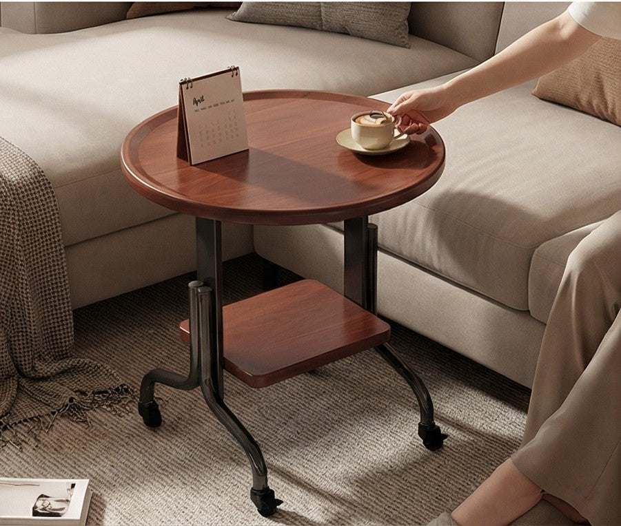 MX134 round wood side table with curved metal legs and lower shelf. Compact 40cm design perfect for living rooms, bedrooms, and small-space interiors.