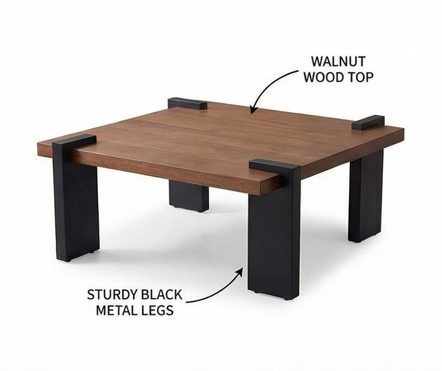 Modern walnut wood coffee table with sturdy black metal legs. Minimalist square design, durable construction, and perfect for contemporary or industrial living rooms.