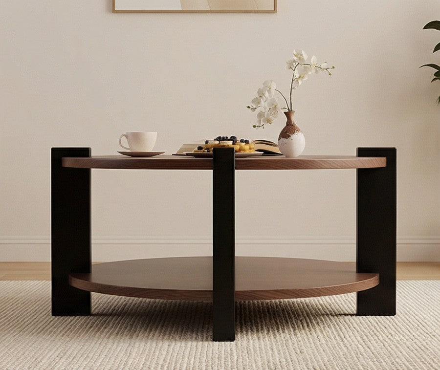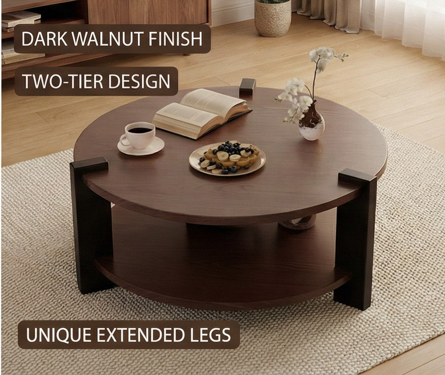 Engineered wood round coffee table with two-tier storage and dark walnut finish. Elegant, durable, and perfect as a modern or classic living room centerpiece.