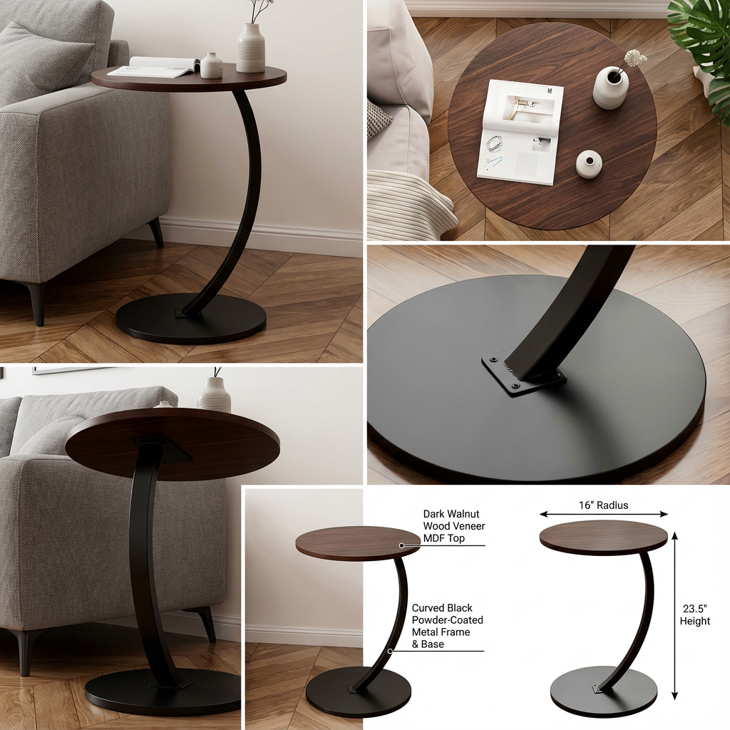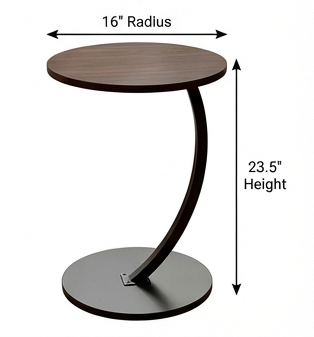 Elevate your space with this Modern Walnut Round Side Table, designed with a striking blend of warm wood tones and sleek contemporary styling. The tabletop features a dark walnut wood veneer MDF surface, highlighting realistic natural grain patterns that bring depth and character to your room. Its standout feature is the curved black powder-coated metal frame, forming a smooth, sculptural silhouette that adds visual elegance from every angle. The design flows seamlessly into a wide circular metal base, ensuring the table remains stable while maintaining a modern, lightweight look. Compact yet functional, this round side table is perfect for placing beside sofas, accent chairs, or beds. Use it to hold drinks, books, décor, plants, candles, or your favorite accessories. This piece enhances any modern, minimalist, Scandinavian, or industrial-styled interior with effortless sophistication.