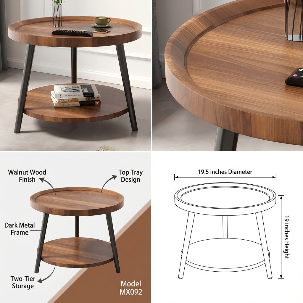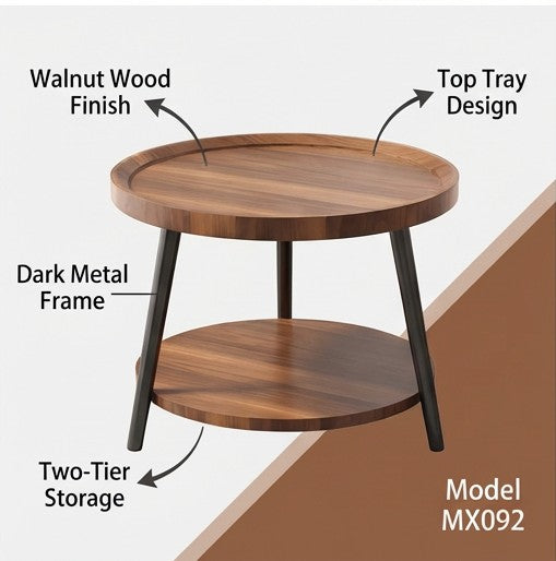Enhance your home with the clean, modern look of the MX092 Round Walnut Side Table, designed to deliver both style and functionality in a compact footprint. The beautifully crafted tabletop features a walnut wood finish with warm natural grain and a raised tray-style edge, helping keep your items secure while adding an elevated, sophisticated look. Supported by a dark metal frame, this table provides excellent stability without compromising its sleek design. The versatile two-tier structure includes a spacious lower shelf, perfect for storing books, plants, candles, décor, and everyday essentials—making it a practical addition to small and large spaces alike. Perfect as a side table, nightstand, accent table, or display stand, the MX092 blends effortlessly with modern, Scandinavian, rustic, and minimalist interior styles.