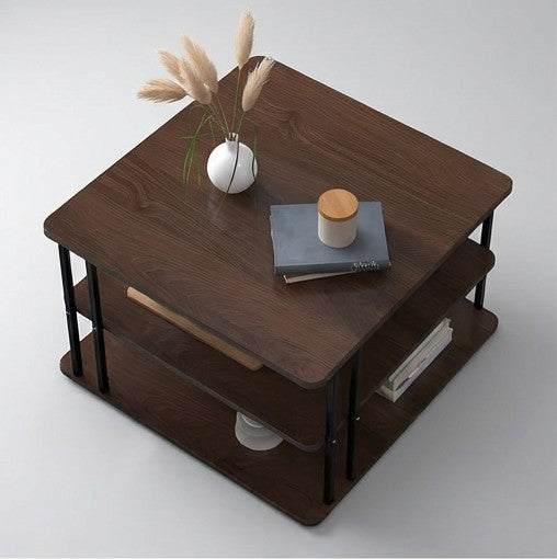 Three-tier dark walnut side table with a black metal frame and ample storage. Durable, stylish, and perfect for living rooms, bedrooms, and small spaces.