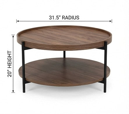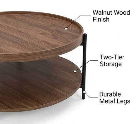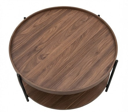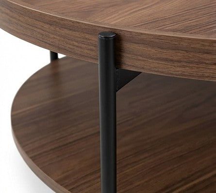 Modern round walnut coffee table with a lower storage shelf and black metal legs. Stylish, durable, and perfect for contemporary or minimalist living rooms.